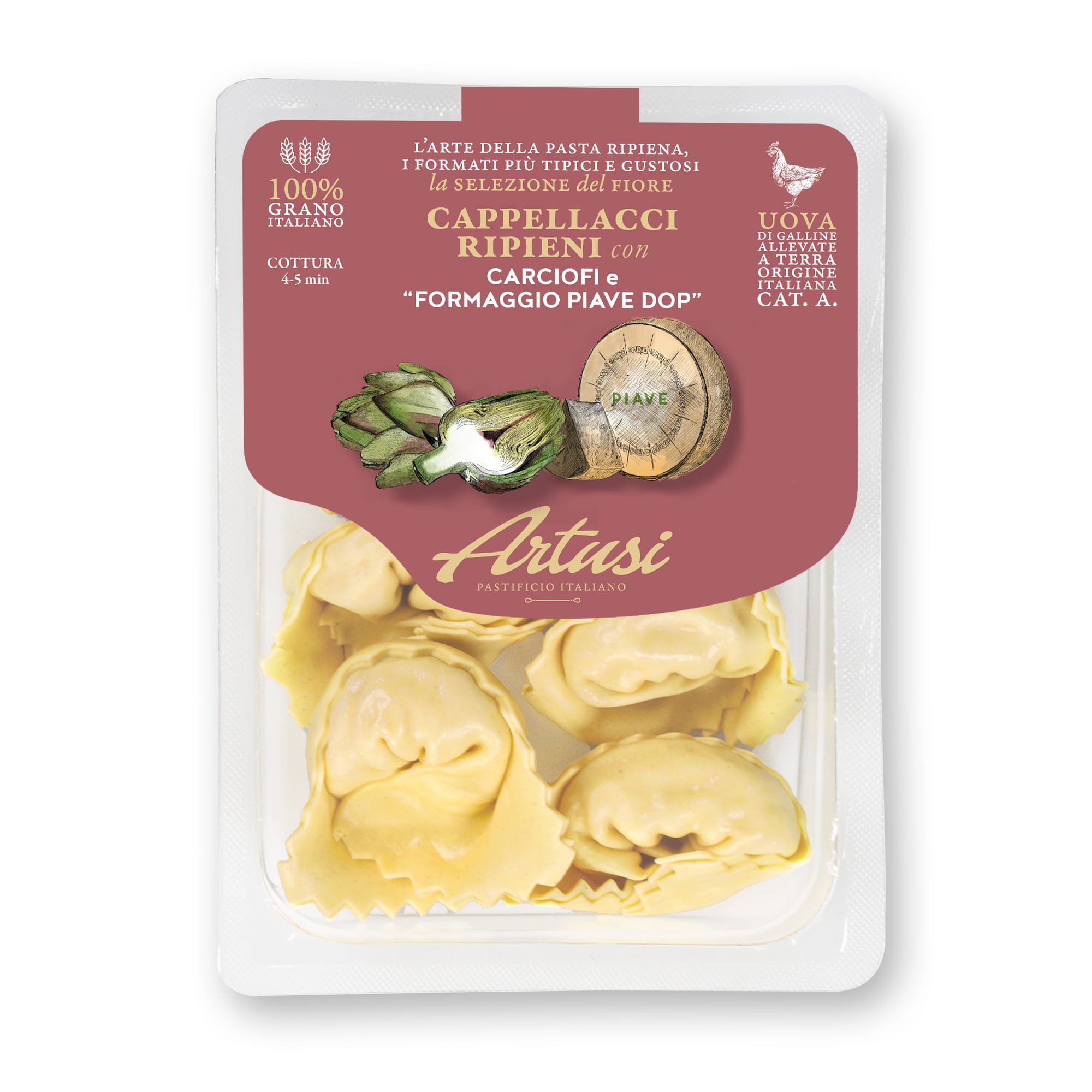 Ingredienti: (Pasta fresca all’uovo 55%): farina di GRANO tenero (origine Italia), UOVA fresche pastorizzate CAT. A 32% (origine Italia), semola di GRANO duro (origine Italia). (Ripieno 45%): ricotta fresca (LATTE vaccino (origine Italia), siero di LATTE (origine Italia), sale, acido lattico), carciofi 23%, formaggio Piave DOP* 10% (LATTE, sale, caglio), olio di semi di girasole, pane grattugiato (farina di GRANO tenero, sale, lievito di birra), acqua, sale marino, cipolla, prezzemolo, vino bianco (contiene SOLFITI), piante aromatiche, succo di limone, estratto di lievito, amido di riso, correttore di acidità: acido lattico, zucchero, pepe, aglio.